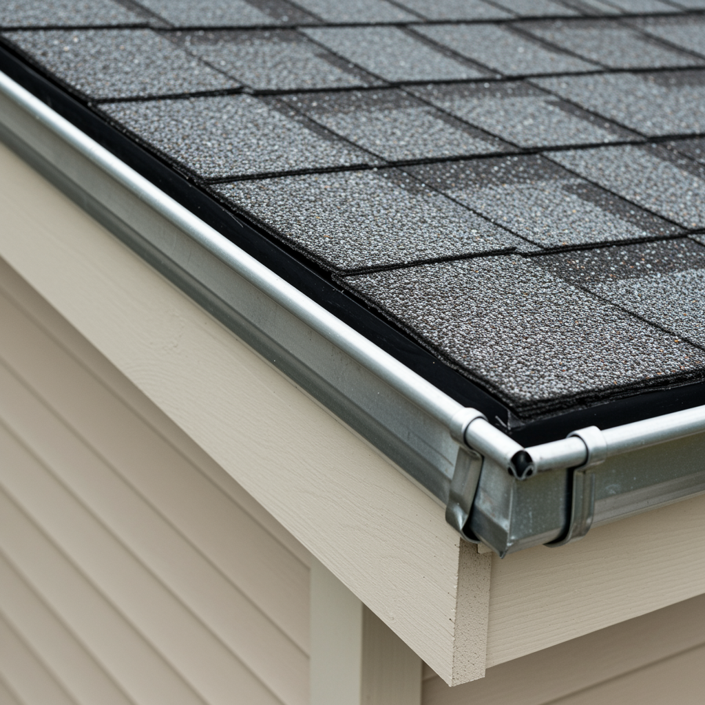 Newly installed gutter system on suburban home roof with clean seamless finish for roofing contractor